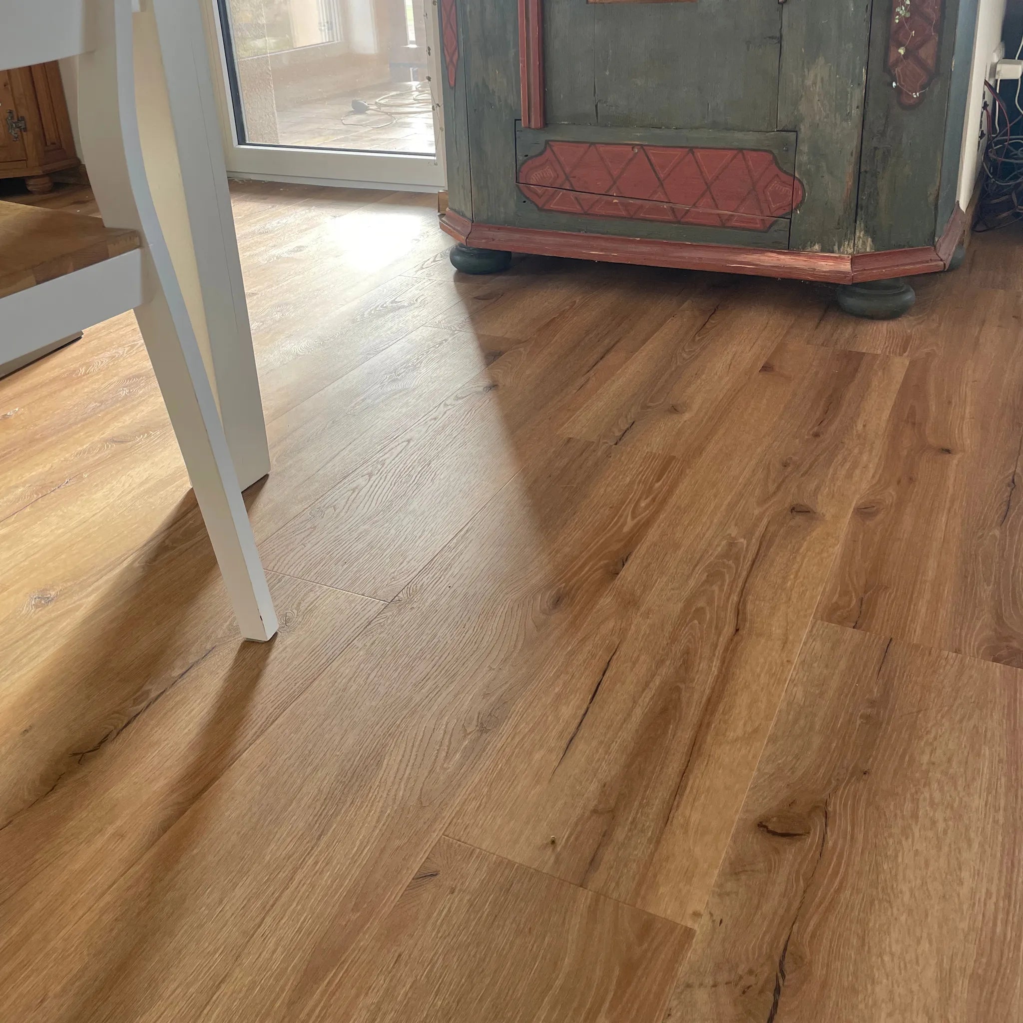Unsere Böden überzeugen durch eine authentische Synchronprägung, die echtes Holz optisch und haptisch perfekt nachbildet. Die Struktur des Bodens folgt exakt der natürlichen Maserung, wodurch ein täuschend echter Look entsteht. Jede Diele wirkt einzigartig und verleiht deinen Räumen eine warme, natürliche Atmosphäre. Beim Darüberstreichen spürst du die feinen Holzdetails, die optisch perfekt mit dem Design übereinstimmen. So genießt du die Schönheit von Holz ohne die aufwendige Pflege, die echtes Material oft erfordert.