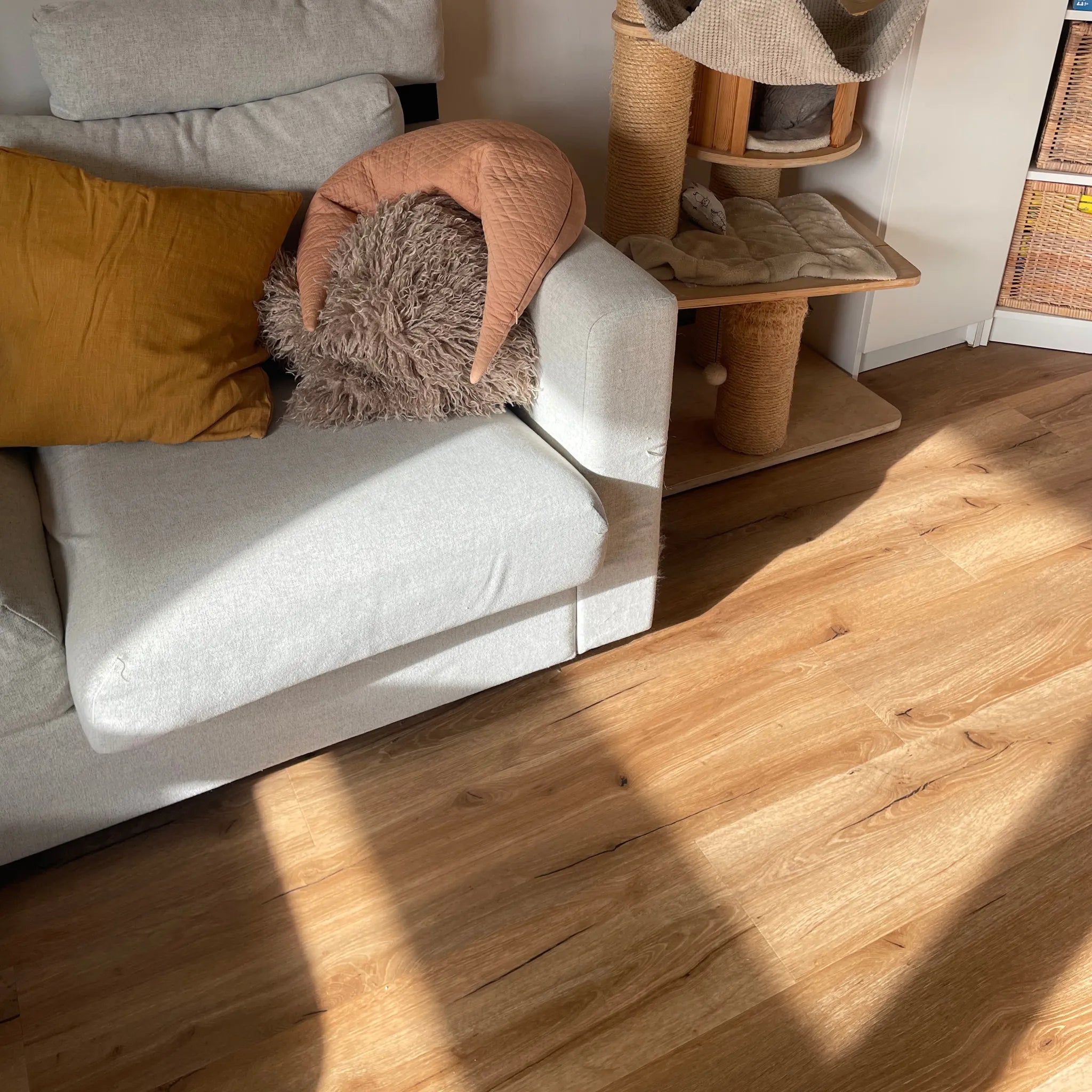 Unsere Böden sind zu 100 % wasserfest und bieten damit maximale Flexibilität in allen Wohnbereichen. Egal ob in der Küche, im Badezimmer oder im Eingangsbereich – Wasser, Feuchtigkeit oder verschüttete Flüssigkeiten können dem Boden nichts anhaben. Dank der innovativen Materialzusammensetzung bleibt der Belag formstabil und quillt auch bei längerem Kontakt mit Wasser nicht auf. Dies macht ihn nicht nur extrem pflegeleicht, sondern auch langlebig und widerstandsfähig gegen alltägliche Herausforderungen. Perfekt für Familien, Haustierbesitzer oder feuchte Räume.